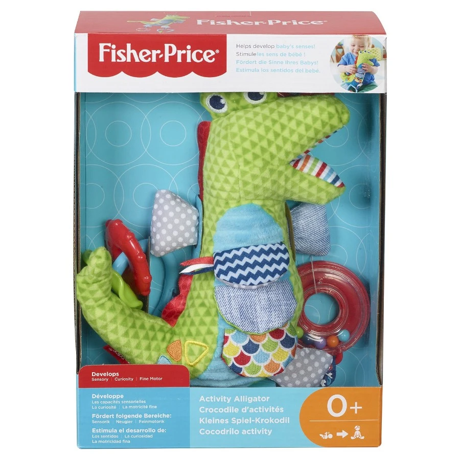 The Fisher-Price Activity Alligator is a playing and activity toy set that was specifically designed to attract an infant babyís attention and allow the baby to experience sensory learning while they touch, grasp, grip, feel and even bite on different parts of this infant activity toy piece. The baby infant develops their primary senses at an early age as they try to negotiate and make sense of the world around them. The 5 primary senses needed to be developed during this time are sight, touch, hearing, smell and taste. This alligator activity has colourful rings that click as the baby spins them around, and the alligator will rattle if it is shaken. The many different bright colours of this Activity Alligator will attract the babyís sight while the action of grasping, grabbing, holding, turning and shaking this Activity Alligator will help develop and strengthen the fine motor skills while their senses are stimulated. Suitable for ages 6 months and above.