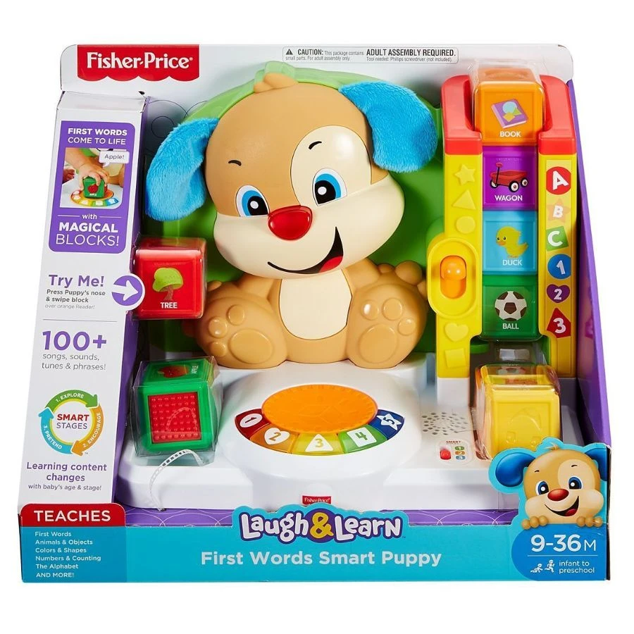 Laugh and Learn First Words Smart Puppy from Fisher Price, makes learning fun for your little one. Many fun words, sounds, phrases, songs, and hands-on activities will make their playtime even more fun. There are 8 large blocks of different colours with different objects printed on them. There is a large puppy that interacts with the player. Also included is a smart reader in front of the puppy that speaks out different sounds/words/phrases when children swipe the blocks over them. A chute is included, which the children can use to tumble the blocks while pressing the puppy’s nose, lights it up, and plays cheerful music. The large puppy is biscuit in colour and has large blue furry ears. The puppy and chute sit on a broad, sturdy white base. Laugh and Learn First Words Smart Puppy from Fisher Price is recommended for children between 9 months and 3 years.