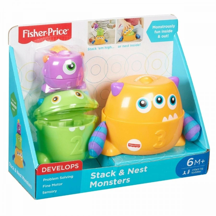 The Fisher-Price Stack & Nest Monsters playset is designed as a play and learn playset for your young toddler to play with and enjoy learning activities while playing. This playset comprises 3 monsters, each is different and unique and each is of a different size. Each of the monsters also has a different build, body colours, and textures or body materials so your young toddler can feel and learn about the differences and play with these monsters. Monster 1 is the smallest; it is purple and its body can be twisted and clicked so that your toddler can experience and practise twisting objects. Monster 2 is green and has a rattle inside that can be shaken to hear its sounds. Monster 3 is the largest one and is yellow with ribbon hair on its sides. Your young toddler can play with these monsters to stack them up and build a monster tower, or by having the smallest monster being swallowed by the larger one and the largest monster swallowing up all of them in a nesting way. Suitable for ages 6 months and up.