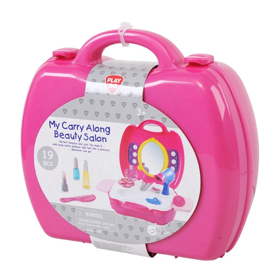 Open your Beauty Salon with this Playgo Beauty Salon kit that becomes a carry case. Now you can style up yourself, all your favourite dolls, your friends or even your family with this bright pink carry case that opens up to a fully equipped hair and beauty salon. It has 19 pieces in total including one comb, one toy hairdryer, one stylish mirror, one pretend lipstick, and one pretend nail polish, toy makeup kit with brushes, pretend perfume, hairpins and more. All of your accessories store nicely in the case and have their compartments when you are ready to set up shop. Once you close it up, you can take it with you anywhere. Ideal for pretend play and imaginative role play. The carry case is made out of plastic and non-toxic materials. When closed, the carry case measures approximately 24 x 23 x 10 cm. Recommended for ages 3 and over. Batteries are not required.