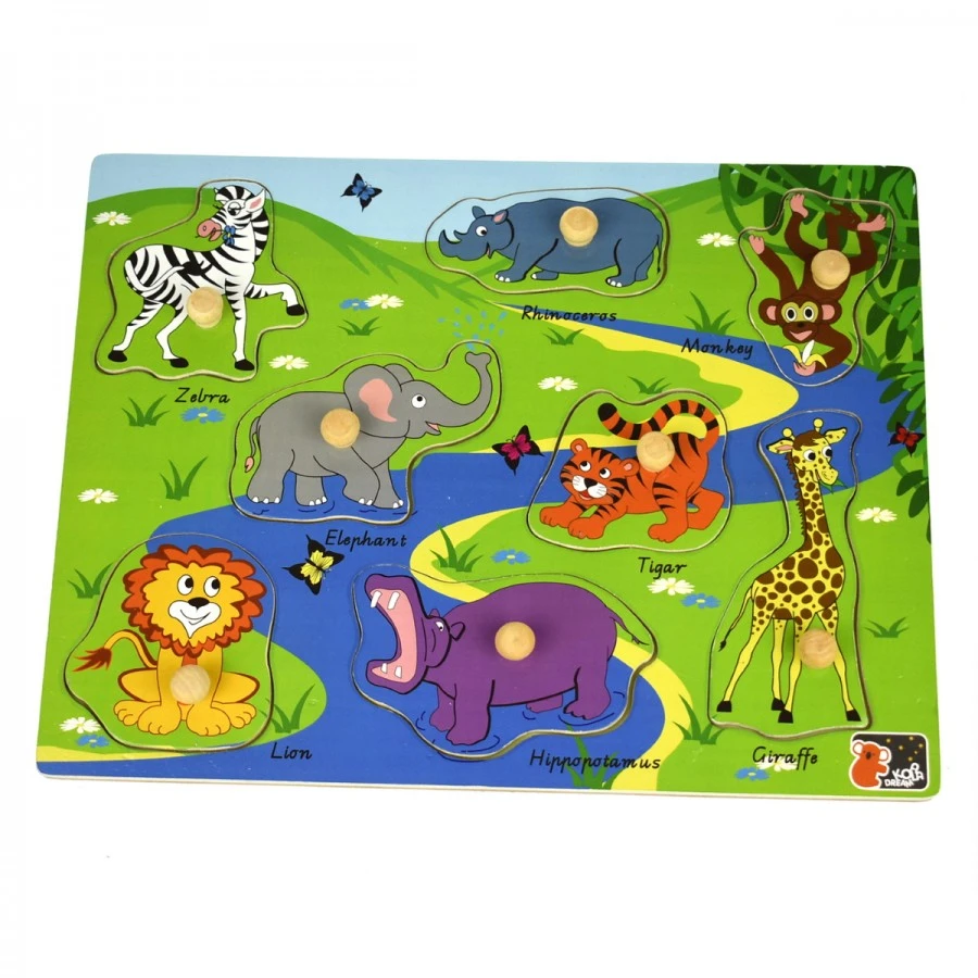 For young children, the concept of fear is somewhat alien, which is what makes them little daredevils. They would jump from heights, poke their fingers into electrical sockets and put marbles in their mouth given a chance-all because of their innate curiosity. Wild animal figures and characters, therefore, don’t spell “danger”, but rather “friendliness” and “fun” in their world! The Peg Puzzle 2 In 1 Safari Animal is a lovely, sturdy, brightly coloured little wooden puzzle designed as an educational toy for small children. Along with introducing them to different creatures of the wild, it also encourages children to think, feel and match the pieces with the correct slots. It incorporates the much-loved peek-a-boo concept, rewarding children with the revelation of the animal’s exact colour when they use the wooden peg to take the piece out of its slot. The puzzle is ideal for children above the age of 18 months.