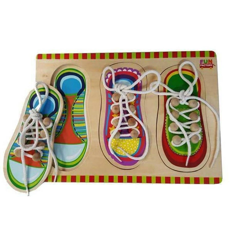 Puzzle Shoe Lacing Wood is a fun educational toy by the prominent brand Fun Factory. It is a vast puzzle board with puzzle pieces in the shape of shoes. This puzzle is made from polished and smooth wood, and it measures around 29 cm x 21 cm. This toy puzzle has a very colourful surface, having 3 pieces of designed shoes and the printed surface in the shape of a shoe underneath the puzzles. Alongside being a puzzle, this board also allows the kids to learn to tie up shoelaces in a fun manner. The game pack includes a board, 3 shoe puzzle pieces, 3 white cotton laces, and a storage bag. The shoes have little wooden balls attached to them with a hole within. The laces can tie their way through the knobs. The lacing and tying experience allows the kids to develop their fine motor skills, hand-eye coordination, visual perceptual skills, and more. This colourful learning game is recommended for children above the age of three.