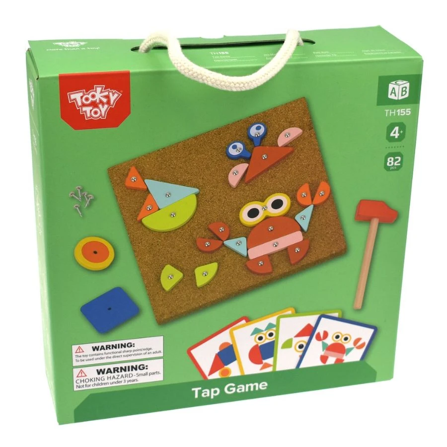 Here is a little construction game that children will adore. It has everything kids need to create interesting patterns and pictures with the help of a little hammer. Tap Tap set includes pattern cards with designs that can be followed. When the kids have located the correct coloured shape, they need to thread the nail through the hole and slowly tap the nail on the board to secure the wooden shape in its place. They need to continue doing this till they have created a picture. They are free to create their own picture or design if they donโt want to use the patterns mentioned on the cards. This Tap Tap set contains 30 wooden pieces, 1 board, 1 hammer, 40 nails, and 10 pattern cards with interesting pictures to create. The Tap Tap set is made from metal, cork, and a timer. The toy set has been painted with non-toxic paint and has high-quality finishing. It is great for children and helps them develop fine motor skills and hand-eye coordination. Tap Tap also boosts creativity and encourages imaginative play. This set is recommended for children aged 4 years and above.