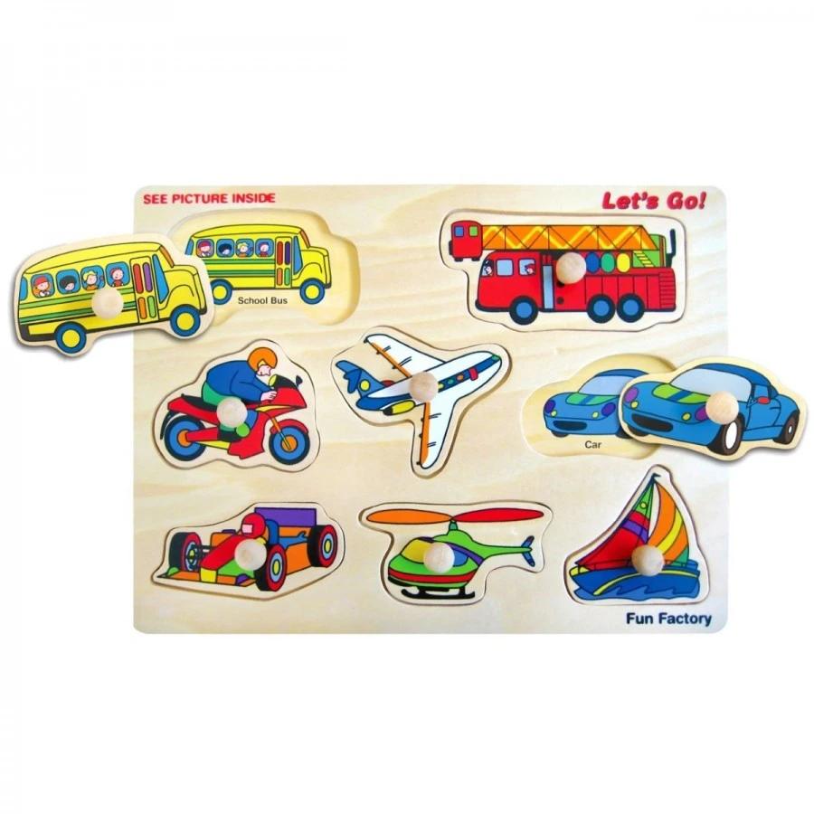 The Wooden Knob Lets Go jigsaw puzzle is a great beginner puzzle. Your little toddler can learn and recognise different types of transports with this puzzle. It features eight different types of transportation: aeroplane, bike, bus, car, helicopter, racing car, fire engine, and a boat. Your tiny tot would enjoy piecing this puzzle together by matching eight different coloured vehicles with a matching picture on the board. The little wooden knobs make it easy for your child to grasp with their little fingers. Puzzling is a great way for children to develop motor skills, problem-solving skills, and building skills. This wooden knob puzzle features everything on the go and is fun for kids to learn about shape, color, and vocabulary. The puzzles also improve the hand and eye coordination of children. This Wooden Knob Lets Go puzzle set is recommended for kids aged two and above.