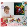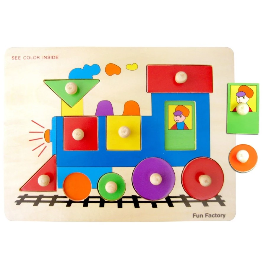 Fun Factory designs the Wood Knob Puzzle Train as an educational toy which helps children learn colours and shapes. It features a wooden puzzle board base with a train painted on it. The puzzle pieces have sturdy wooden knobs and a matching picture underneath for kids to identify which piece fits where easily. It uses bright colours like green, red, orange, purple, yellow and blue-the puzzle pieces are of different colours and different shapes like circle, triangle, square and rectangle. The puzzle can help children learn about colours and shapes as they try to put the puzzle pieces in their correct places. The knobs are easy to hold even for small hands, and the puzzle uses non-toxic paints. It conforms to Australian toy standards. To play the puzzle, pull out the pieces and place them before the child. Let them put the pieces one by one, holding the pieces by the knob and trying to identify the right fit. The entire puzzle is made of wood and measures 22cm high and 30cm long. It is recommended for children over 2 years old.