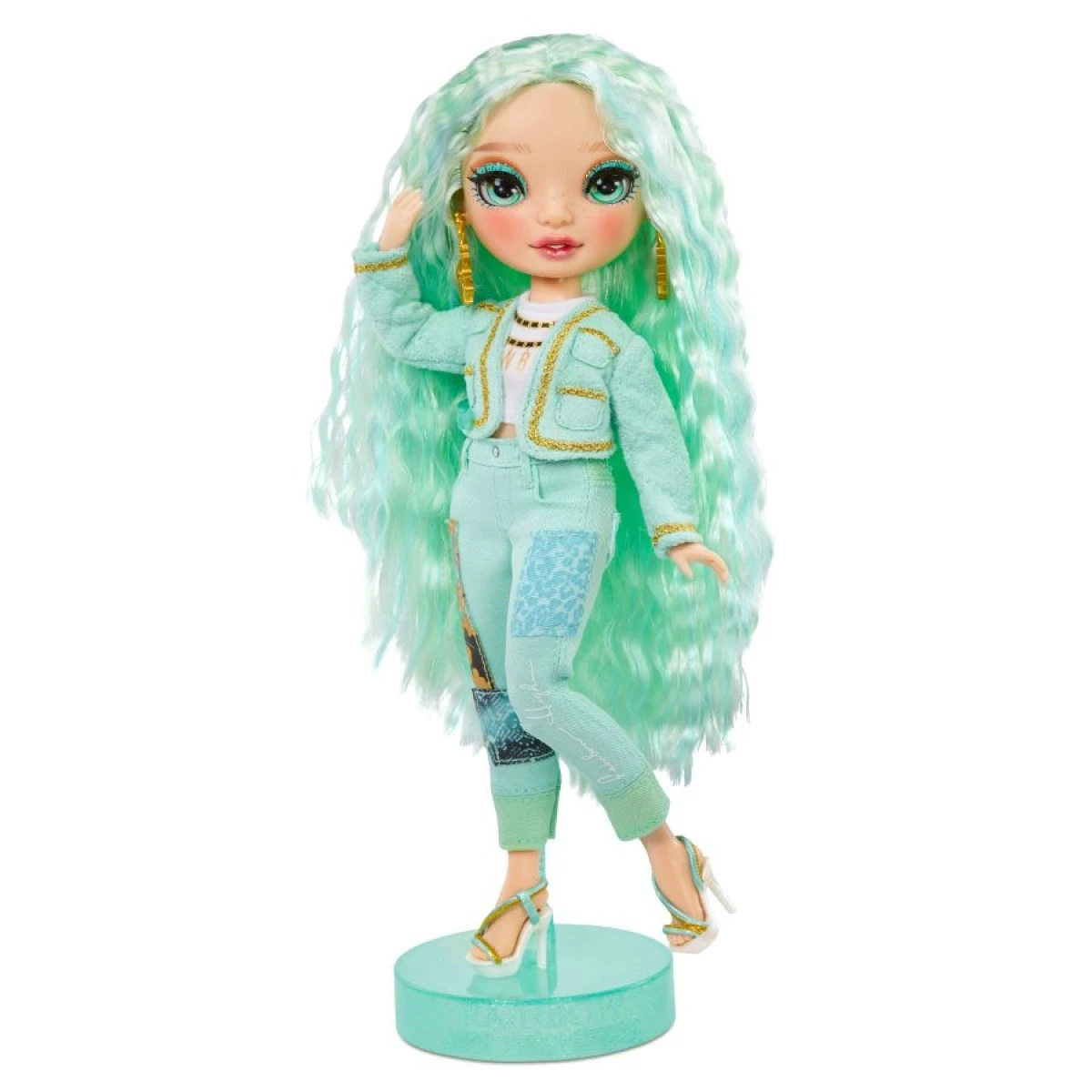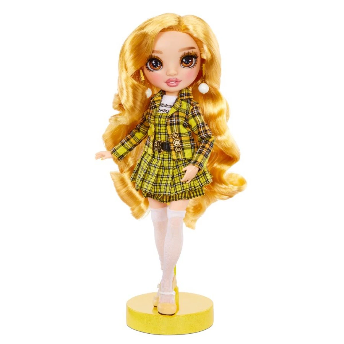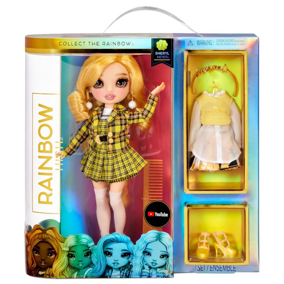 Sheryl Meyer has a unique style and is dressed entirely in marigold, a lovely colour. Her attire boasts amazing detailed features, magnificent hair, long eyelashes, and glass eyes. Collect the entire rainbow of stunning Rainbow High Fashion dolls. Sheryl comes with two complete doll ensembles, including doll clothes, shoes, and accessories. Dress her up in each clothing, then mix and match the outfits and accessories to encourage creativity and storytelling. Want to witness the Trendsetter fashions? Sheryl’s love of textile design is reflected in her fashionable style. She’s dressed in a matching yellow plaid twill dress with belt buckle and jacket with moulded buttons, a tee, chiffon white knee-high socks, and Mary Jane heels. A long-sleeved sheer chiffon top, a yellow sleeveless sweater top, a patterned skirt, and strappy shoes make up her second ensemble. Her limbs and legs bend for a variety of glamorous poses, or you may display her on the supplied doll stand. A fashion doll, two complete doll clothes, two pairs of shoes, and doll accessories such as a doll comb, earrings, a headband, two hangers, and a doll stand. The Animated Series is available on YouTube and Netflix. Simply Google “Rainbow High Dolls.”